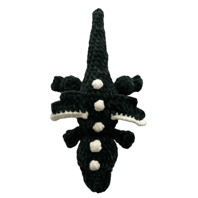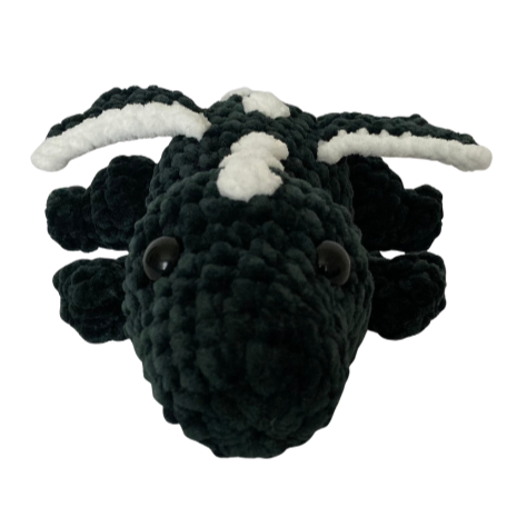 This crocheted plushie is handmade by Hanna with super soft yarn. It is approximately 3.5 inches tall, 8.5 inches wide, and 13.5 inches long.